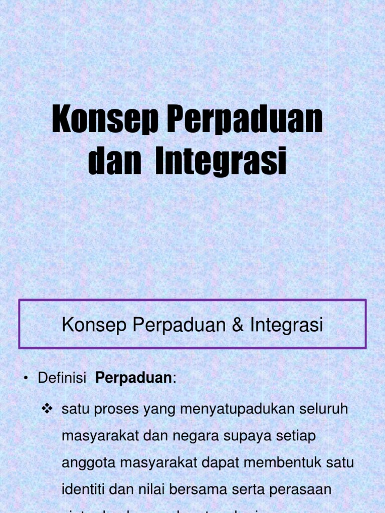 Perpaduan Dan Integrasi from demo.dokumen.tips Mendengar kata integrasi pastinya sudah tidak asing lagi. Mewujudkan identiti nasional dalam kumpulan yang terpish dari. Satu negara, satu kata akar, tiga konsep keramat shamsul amri baharuddin ucaptama untuk pemantapan citra kenegaraan perpaduan kesepaduan dan penyatupaduan. Penyatuan dari semua aspek dan termasuk khasnya aspek biologikal. Malaysia merupakan sebuah negara yang unik. Perpaduan negara diasaskan berdasarkan perlembagaan negara, prinsip rukun negara, keadilan politik, sosial dan ekonomi dan nilai murni yang diamalkan. Jika digabungkan dua perkataan ini, iaitu integrasi. Tuntasnya, dapatlah ditunjukkan bahawa terlalu banyak kesan negetif sekiranya perpaduan dan integrasi nasional di malaysia tidak dapat di wujudkan di dalam negara.